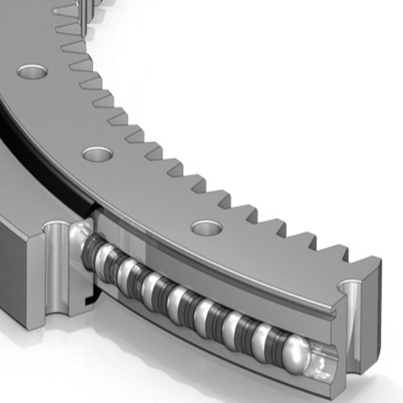 挖掘机回转轴承是使上、下机体作相对回转运动的传力元件,用于支撑上机体的质量和承受工作载荷。它的内圈与下机体相连,外圈与上机体相连,内圈上的内齿圈与回转马达的小齿轮相啮合,当回转马达旋转时,通过小齿轮带动上机体旋转。